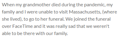 When my grandmother died during the pandemic, my family and I were unable to visit Massachusetts, (where she lived), to go to her funeral. We joined the funeral over FaceTime and it was really sad that we weren't able to be there with our family.