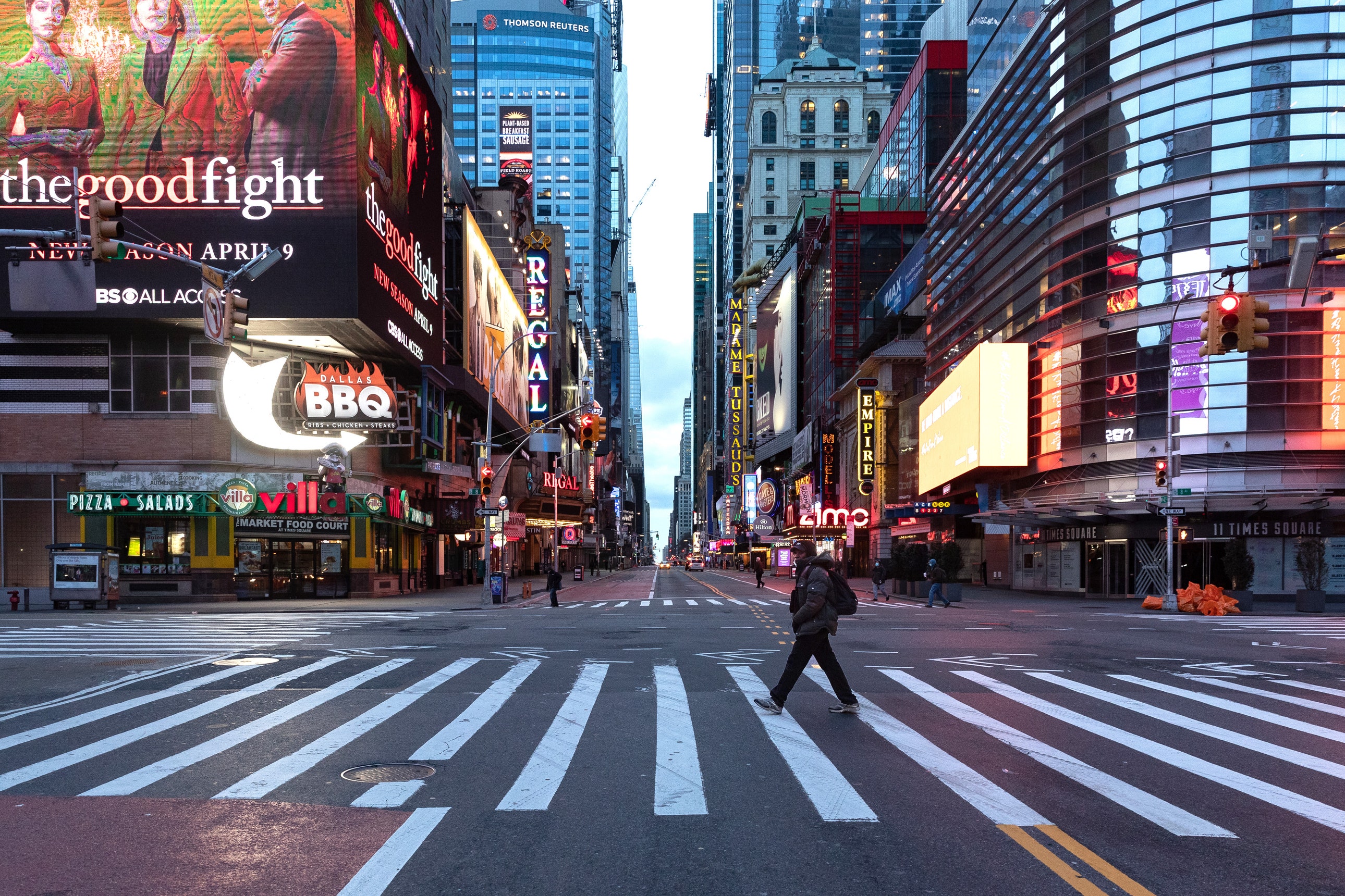 “A pedestrian crosses a nearly empty street in Times Square, New York's most-visited tourist attraction, on Wednesday, April 1.”