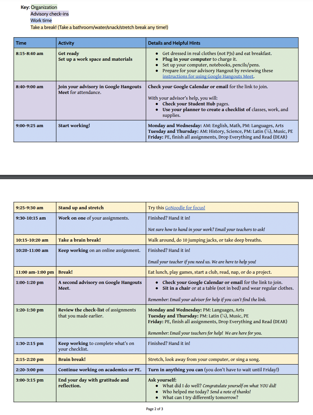 When we returned from spring break in 2020, we were sent a PDF of a sample schedule. Online school was mostly asynchronous (async) for a few weeks before we switched to a live virtual format. We would usually have one or two synchronous advisories per day and the rest of the day would be independent work. I had just returned early from a family vacation and we had only just begun quarantining. When we received this schedule, we still thought that the shutdown would only last a few weeks before life would return to normal and this schedule marks the very beginning of my pandemic experience.