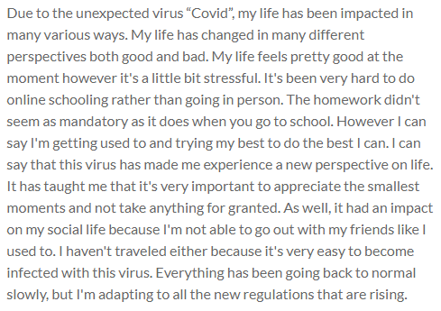 Due to the unexpected virus “Covid”, my life has been impacted in many various ways. My life has changed in many different perspectives both good and bad. My life feels pretty good at the moment however it's a little bit stressful. It's been very hard to do online schooling rather than going in person. The homework didn't seem as mandatory as it does when you go to school. However I can say I'm getting used to and trying my best to do the best I can. I can say that this virus has made me experience a new perspective on life. It has taught me that it's very important to appreciate the smallest moments and not take anything for granted. As well, it had an impact on my social life because I'm not able to go out with my friends like I used to. I haven't traveled either because it's very easy to become infected with this virus. Everything has been going back to normal slowly, but I'm adapting to all the new regulations that are rising.