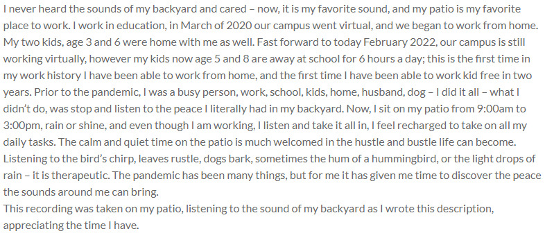 This recording was taken on my patio, listening to the sound of my backyard as I wrote this description, appreciating the time I have.