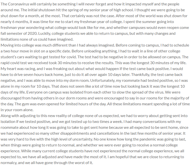 The Coronavirus will certainly be something I will never forget and how it impacted myself and the people around me. The initial shutdown hit the spring of my senior year of high school. I thought we were going to be shut down for a month, at the most. That certainly was not the case. After most of the world was shut down for nearly 6 months, it was time for me to start my freshman year of college. I spent the summer going into freshman year wondering what college would look like for me, and whether campuses would even reopen come fall semester of 2020. Luckily, college students we able to return to campus, but with many changes and limitations none of us could have imagined.