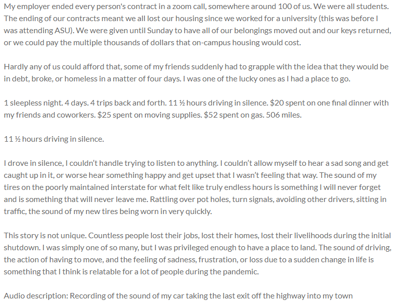This story is not unique. Countless people lost their jobs, lost their homes, lost their livelihoods during the initial shutdown. I was simply one of so many, but I was privileged enough to have a place to land. The sound of driving, the action of having to move, and the feeling of sadness, frustration, or loss due to a sudden change in life is something that I think is relatable for a lot of people during the pandemic.
