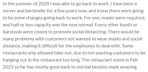 In the summer of 2020 I was able to go back to work. I have been a server and bartender for a few years now, and knew there were going to be some changes going back to work. For one, masks were required, and half or less capacity was the new normal. Every other booth or barstools were closed to promote social distancing. There would be many problems with customers not wanted to wear masks and social distance, making it difficult for the employees to deal with. Some restaurants only allowed take-out, due to not wanting customers to be hanging out in the restaurant too long. The restaurant scene in Feb 2022 so far has mostly gone back to normal besides mask wearing.
