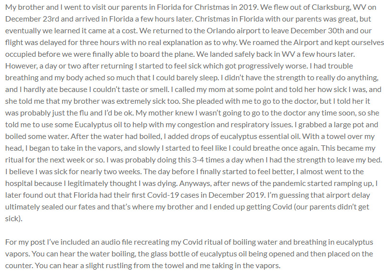 My brother and I went to visit our parents in Florida for Christmas in 2019. We flew out of Clarksburg, WV on December 23rd and arrived in Florida a few hours later. Christmas in Florida with our parents was great, but eventually we learned it came at a cost. We returned to the Orlando airport to leave December 30th and our flight was delayed for three hours with no real explanation as to why. We roamed the Airport and kept ourselves occupied before we were finally able to board the plane. We landed safely back in WV a few hours later. However, a day or two after returning I started to feel sick which got progressively worse. I had trouble breathing and my body ached so much that I could barely sleep. I didn’t have the strength to really do anything, and I hardly ate because I couldn’t taste or smell. I called my mom at some point and told her how sick I was, and she told me that my brother was extremely sick too. She pleaded with me to go to the doctor, but I told her it was probably just the flu and I’d be ok. My mother knew I wasn’t going to go to the doctor any time soon, so she told me to use some Eucalyptus oil to help with my congestion and respiratory issues. I grabbed a large pot and boiled some water. After the water had boiled, I added drops of eucalyptus essential oil. With a towel over my head, I began to take in the vapors, and slowly I started to feel like I could breathe once again. This became my ritual for the next week or so. I was probably doing this 3-4 times a day when I had the strength to leave my bed. I believe I was sick for nearly two weeks. The day before I finally started to feel better, I almost went to the hospital because I legitimately thought I was dying. Anyways, after news of the pandemic started ramping up, I later found out that Florida had their first Covid-19 cases in December 2019. I’m guessing that airport delay ultimately sealed our fates and that’s where my brother and I ended up getting Covid (our parents didn’t get sick).