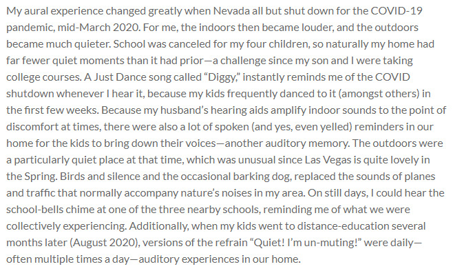 My aural experience changed greatly when Nevada all but shut down for the COVID-19 pandemic, mid-March 2020. For me, the indoors then became louder, and the outdoors became much quieter. School was canceled for my four children, so naturally my home had far fewer quiet moments than it had prior—a challenge since my son and I were taking college courses. A Just Dance song called “Diggy,” instantly reminds me of the COVID shutdown whenever I hear it, because my kids frequently danced to it (amongst others) in the first few weeks. Because my husband’s hearing aids amplify indoor sounds to the point of discomfort at times, there were also a lot of spoken (and yes, even yelled) reminders in our home for the kids to bring down their voices—another auditory memory. The outdoors were a particularly quiet place at that time, which was unusual since Las Vegas is quite lovely in the Spring. Birds and silence and the occasional barking dog, replaced the sounds of planes and traffic that normally accompany nature’s noises in my area. On still days, I could hear the school-bells chime at one of the three nearby schools, reminding me of what we were collectively experiencing. Additionally, when my kids went to distance-education several months later (August 2020), versions of the refrain “Quiet! I’m un-muting!” were daily—often multiple times a day—auditory experiences in our home.