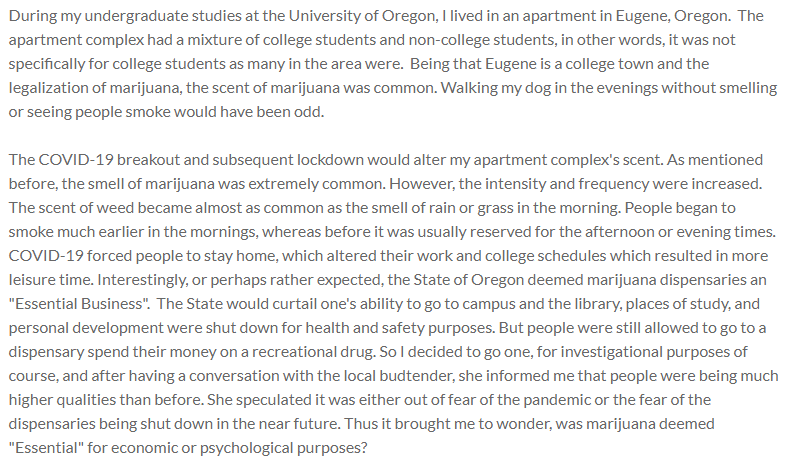The COVID-19 breakout and subsequent lockdown would alter my apartment complex's scent. As mentioned before, the smell of marijuana was extremely common. However, the intensity and frequency were increased. The scent of weed became almost as common as the smell of rain or grass in the morning. People began to smoke much earlier in the mornings, whereas before it was usually reserved for the afternoon or evening times. COVID-19 forced people to stay home, which altered their work and college schedules which resulted in more leisure time. Interestingly, or perhaps rather expected, the State of Oregon deemed marijuana dispensaries an "Essential Business". The State would curtail one's ability to go to campus and the library, places of study, and personal development were shut down for health and safety purposes. But people were still allowed to go to a dispensary spend their money on a recreational drug. So I decided to go one, for investigational purposes of course, and after having a conversation with the local budtender, she informed me that people were being much higher qualities than before. She speculated it was either out of fear of the pandemic or the fear of the dispensaries being shut down in the near future. Thus it brought me to wonder, was marijuana deemed "Essential" for economic or psychological purposes?