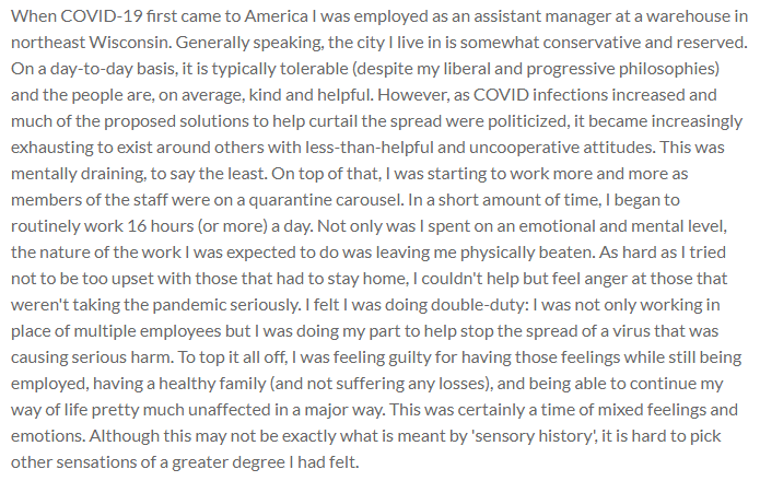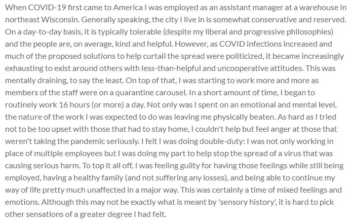 When COVID-19 first came to America I was employed as an assistant manager at a warehouse in northeast Wisconsin. Generally speaking, the city I live in is somewhat conservative and reserved. On a day-to-day basis, it is typically tolerable (despite my liberal and progressive philosophies) and the people are, on average, kind and helpful. However, as COVID infections increased and much of the proposed solutions to help curtail the spread were politicized, it became increasingly exhausting to exist around others with less-than-helpful and uncooperative attitudes. This was mentally draining, to say the least. On top of that, I was starting to work more and more as members of the staff were on a quarantine carousel. In a short amount of time, I began to routinely work 16 hours (or more) a day. Not only was I spent on an emotional and mental level, the nature of the work I was expected to do was leaving me physically beaten. As hard as I tried not to be too upset with those that had to stay home, I couldn't help but feel anger at those that weren't taking the pandemic seriously. I felt I was doing double-duty: I was not only working in place of multiple employees but I was doing my part to help stop the spread of a virus that was causing serious harm. To top it all off, I was feeling guilty for having those feelings while still being employed, having a healthy family (and not suffering any losses), and being able to continue my way of life pretty much unaffected in a major way. This was certainly a time of mixed feelings and emotions. Although this may not be exactly what is meant by 'sensory history', it is hard to pick other sensations of a greater degree I had felt.