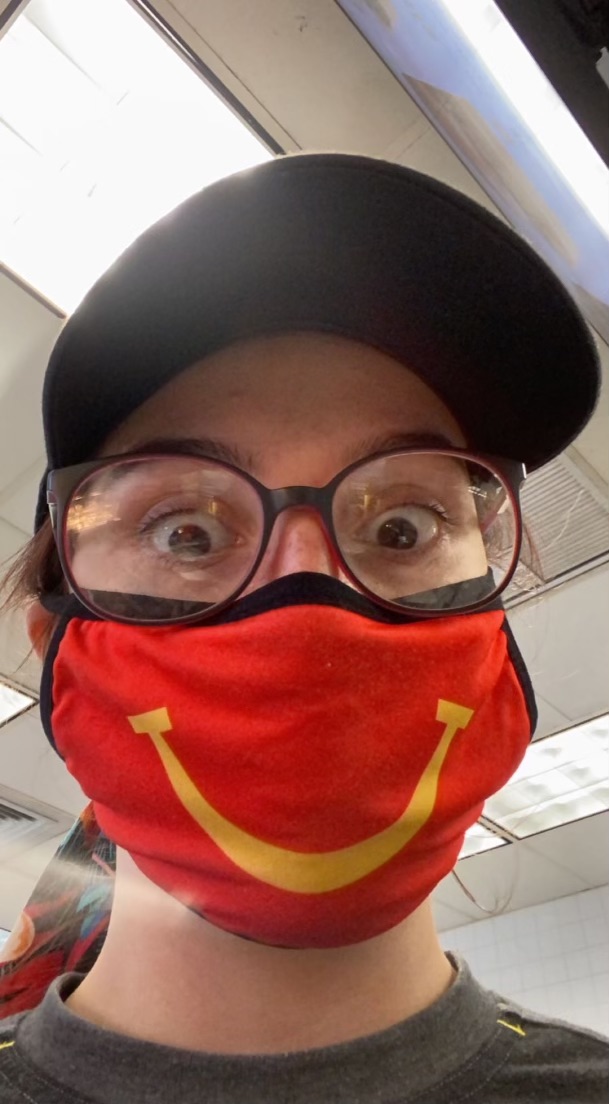 When the pandemic began, I was two weeks into my first job at McDonalds. At this point in the pandemic, masks cost $700 for the case we got at work. One day, when I walked into McDonalds, the manager called me back to the office. I thought I was getting fired since we were overstaffed, and I was trained to work at the kiosk in the now-closed lobby. To my surprise, she didn’t fire me. She explained that we have a new part of our uniform: a McMask. If I said I laughed, that would be an understatement. People were wearing them upside down, so they made a sad face. Even the customers laughed at us. I was always the first person to show my McSpirit, but the McMask would not be seen on me outside of a McWork setting.