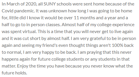 In March of 2020, all SUNY schools were sent home because of the Covid pandemic. It was unknown how long I was going to be home for, little did I know it would be over 11 months and a year and a half to go to in person classes. Almost half of my college experience was spent virtual. This is a time that you will never get to live again and it was cut short by almost half. I am very grateful to be in person again and seeing my friend's even thought things aren't 100% back to normal, I am very happy to be back. I am praying that this never happens again for future college students or any students in that matter. Enjoy the time you have because you never know what the future holds.