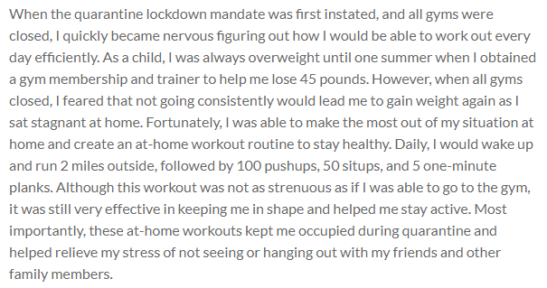 When the quarantine lockdown mandate was first instated, and all gyms were closed, I quickly became nervous figuring out how I would be able to work out every day efficiently. As a child, I was always overweight until one summer when I obtained a gym membership and trainer to help me lose 45 pounds. However, when all gyms closed, I feared that not going consistently would lead me to gain weight again as I sat stagnant at home. Fortunately, I was able to make the most out of my situation at home and create an at-home workout routine to stay healthy. Daily, I would wake up and run 2 miles outside, followed by 100 pushups, 50 situps, and 5 one-minute planks. Although this workout was not as strenuous as if I was able to go to the gym, it was still very effective in keeping me in shape and helped me stay active. Most importantly, these at-home workouts kept me occupied during quarantine and helped relieve my stress of not seeing or hanging out with my friends and other family members.