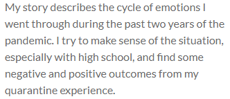 My story describes the cycle of emotions I went through during the past two years of the pandemic. I try to make sense of the situation, especially with high school, and find some negative and positive outcomes from my quarantine experience.