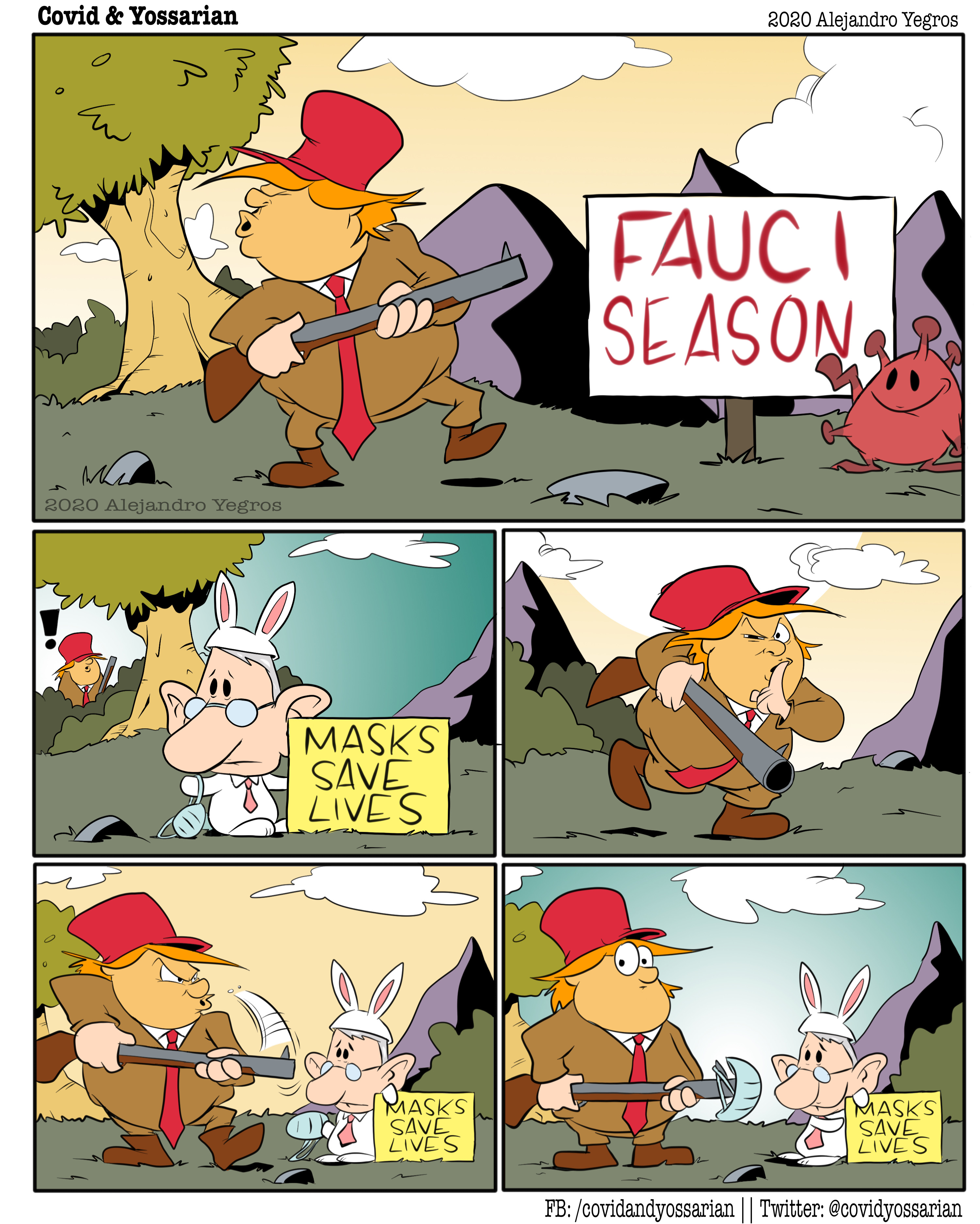 (Cartoon shows Donald Trump with a gun hunting. Dr. Fauci is dressed like a rabbit. The final panel has Fauci placing a mask on the end of Trump's gun. )