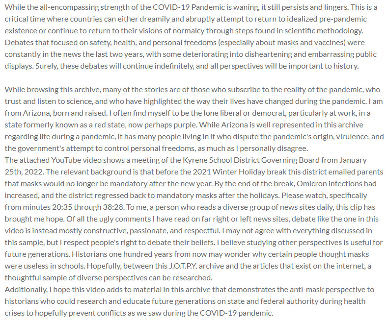 The attached YouTube video shows a meeting of the Kyrene School District Governing Board from January 25th, 2022. The relevant background is that before the 2021 Winter Holiday break this district emailed parents that masks would no longer be mandatory after the new year. By the end of the break, Omicron infections had increased, and the district regressed back to mandatory masks after the holidays. Please watch, specifically from minutes 20:35 through 38:28. To me, a person who reads a diverse group of news sites daily, this clip has brought me hope. Of all the ugly comments I have read on far right or left news sites, debate like the one in this video is instead mostly constructive, passionate, and respectful. I may not agree with everything discussed in this sample, but I respect people's right to debate their beliefs. I believe studying other perspectives is useful for future generations. Historians one hundred years from now may wonder why certain people thought masks were useless in schools. Hopefully, between this J.O.T.P.Y. archive and the articles that exist on the internet, a thoughtful sample of diverse perspectives can be researched.