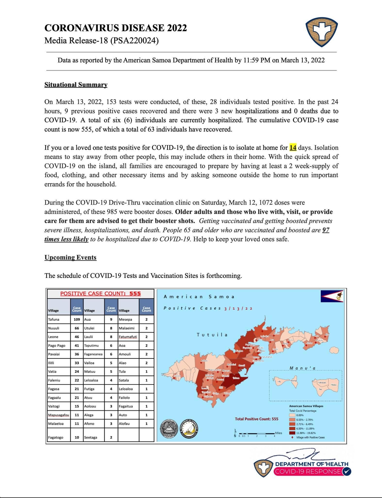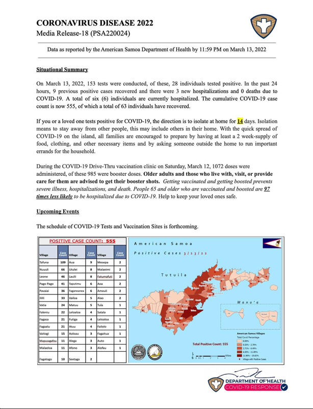 American Samoa, a small U.S territory located in the South Pacific, was the last place to experience the surging numbers of covid cases. When the coronavirus was declared a pandemic at the beginning of 2020, American Samoa was the only place on earth not to have any cases of COVID. To combat the disease, the government of American Samoa barred incoming flights for a whole year from the United States and their neighboring island of Western Samoa. Although the island did not have any COVID cases, the government promoted and maintained the restrictions throughout the island. However, after opening the borders for inbound flights after a year, American Samoa did not report its first Covid case until September 2021. Since then, travel restrictions and quarantine for travelers were enforced, but eventually, a big surge of cases began to be seen in mid-February of this year. The opening of borders to inbound flights brought the disease into the island. Coronavirus cases jumped from only a hundred to 555. It is still considered relatively low worldwide, but it is high for a small island. Fortunately, no fatalities are reported, with more than 80 percent of the population vaccinated. The attached image is data reported weekly by the American Samoa Department of Health to the public to show how many cases are positive in each village and totaled in American Samoa. The people were worried that the disease might cause some fatalities, the government was quick to impose a lockdown restriction called "CODE RED," which barred social gatherings, schools, traveling, and work on February 22. Although the public panicked with the news of coronavirus cases on the island, the government worked to assure the safety of the people by making sure people were aware of the number of cases and the situation with live news updates and weekly data by the Department of Health. I was also worried when I first heard of the surging number of COVID cases at home. Although I moved to the states for school, I made sure I am kept up to date with what is happening back at home. With the fatalities I saw here in the states with Covid, I was also worried for my parents. But it was comforting to see the live updates by the government on social media which kept me closer to home.