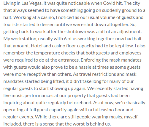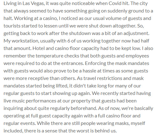 Living in Las Vegas, it was quite noticeable when Covid hit. The city that always seemed to have something going on suddenly ground to a halt. Working at a casino, I noticed as our usual volume of guests and tourists started to lessen until we were shut down altogether. So, getting back to work after the shutdown was a bit of an adjustment. My workstation, usually with 6 of us working together now had half that amount. Hotel and casino floor capacity had to be kept low. I also remember the temperature checks that both guests and employees were required to do at the entrances. Enforcing the mask mandates with guests would also prove to be a hassle at times as some guests were more receptive than others. As travel restrictions and mask mandates started being lifted, it didn't take long for many of our regular guests to start showing up again. We recently started having live music performances at our property that guests had been inquiring about quite regularly beforehand. As of now, we're basically operating at full guest capacity again with a full casino floor and regular events. While there are still people wearing masks, myself included, there is a sense that the worst is behind us.