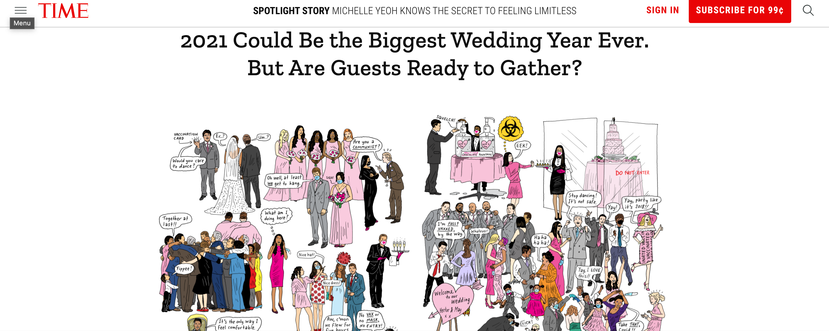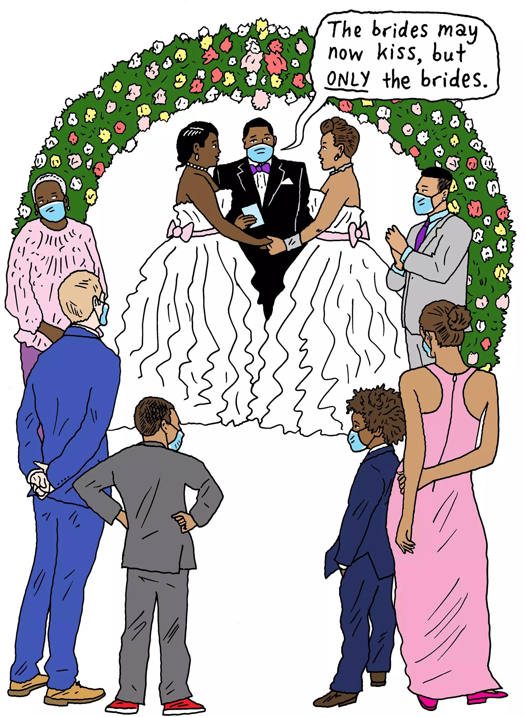 I wanted to highlight this picture from TIME magazine as I hope it demonstrates that masks made people freak out. The idea that the officiant and the people were so distracted and concerned about the two brides either not wearing masks or being the only two kissing while not wearing masks----rather than not being male/female made me smile. I hope some of the pain, anxiety, and discomfort of the pandemic was turned into positivity by distracting people from the meaningless idea of couple's gender and that some LGBTQ opponents realized there are bigger problems in the world.