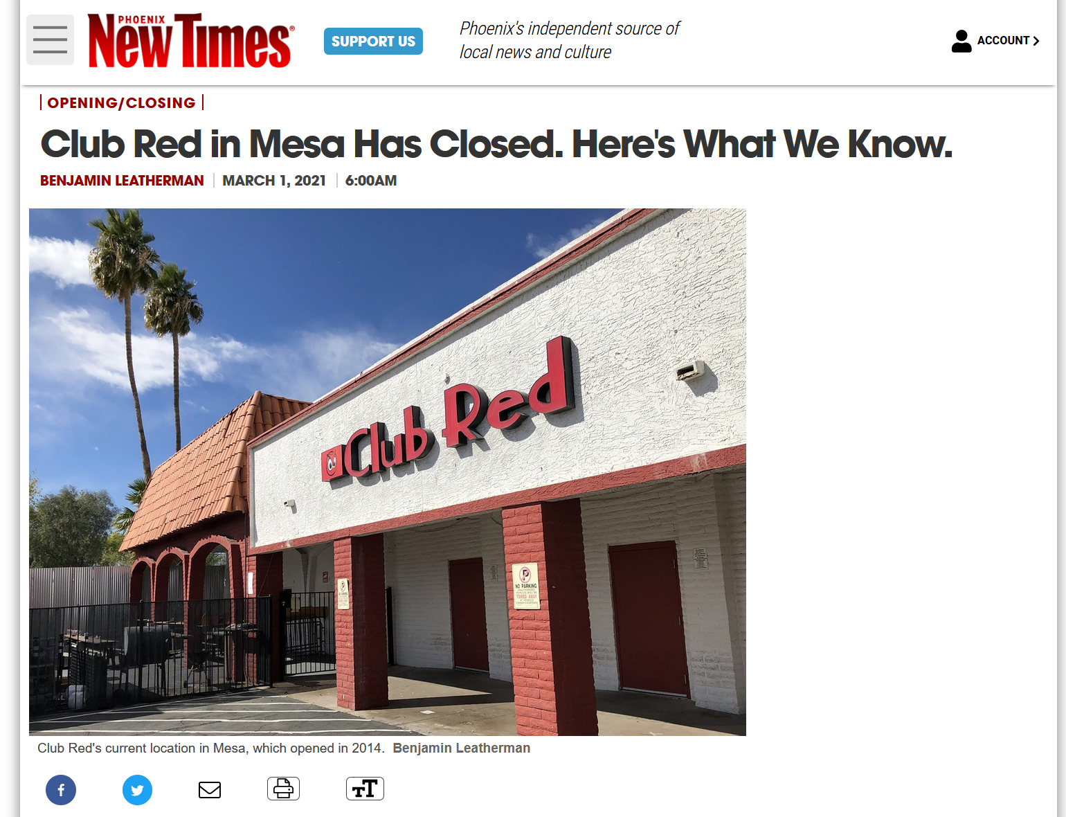 This article details the closing of the popular Mesa concert venue Club Red during March of 2021. Unfortunately, due to an inability to host concerts as a result of COVID-19, Club Red ran out of business and had to close its doors after 15 years of music. Club Red was the first notable local music venue to close in the wake of the pandemic, and it made me sad personally because my own band used to play shows there. I have had the privilege to interact with Kimberly LaRowe of 13th Floor Entertainment, who is featured in the article, on several occasions to book shows for my band, and I never had a bad experience. While it is not explicitly stated that Club Red closed as a result of COVID-19, it his highly likely, as suggested by Kimberly LaRowe in the article. This article does an excellent job of diving deep into how drastically the local Arizona music scene has been affected by COVID-19, especially venue owners and promoters. Also, this article provides a very interesting story of the history of Club Red over the years, and details the subsequent reactions that many local and prominent musicians had to the venues closing, which certainly adds to the archives performing arts collection