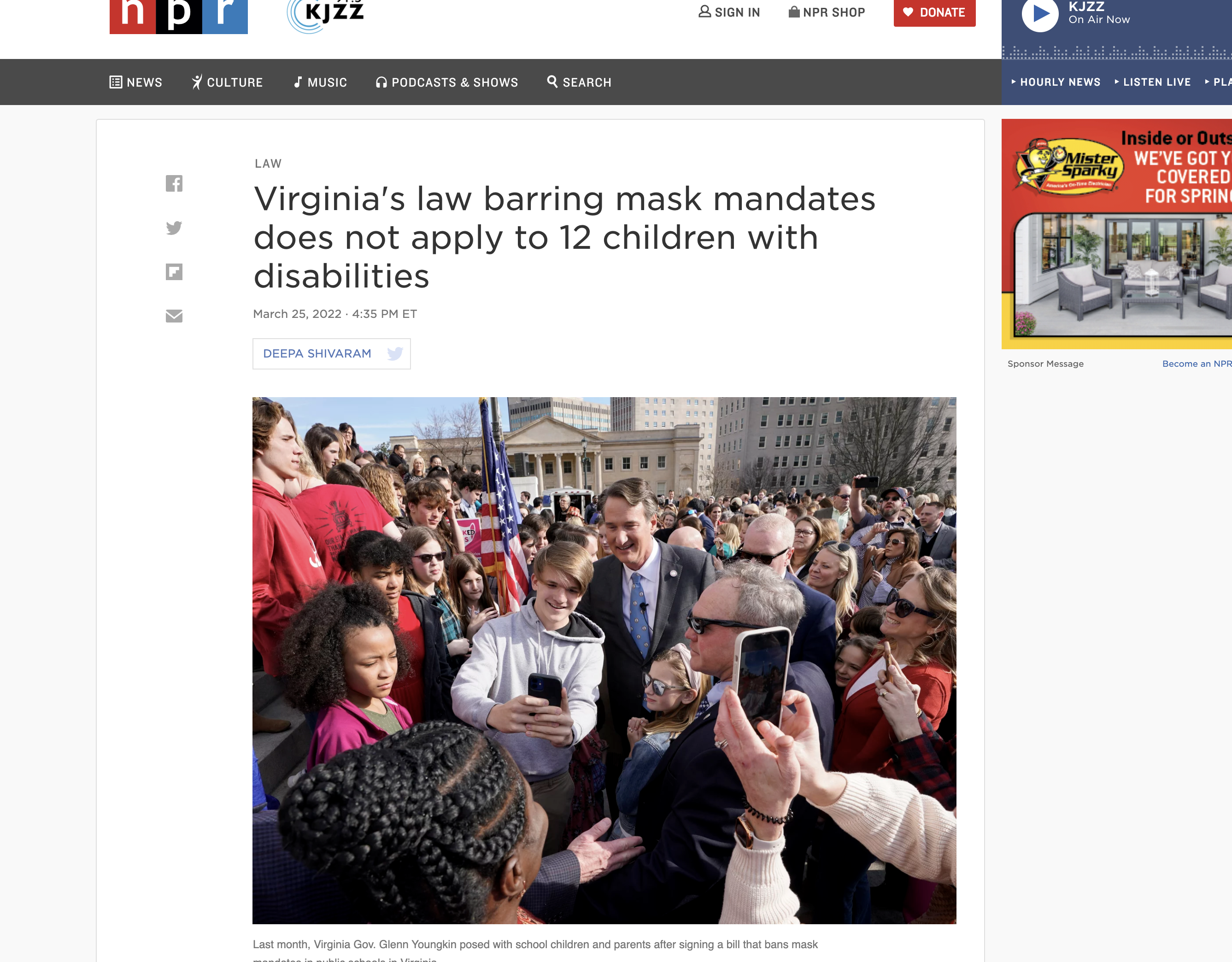 A news article from NPR talks about the parents of 12 children that challenged the newly signed law by Governor Glenn Youngkin to halt the enforcement of that law because it violated the children's rights under the federal American with Disabilities Act. This law would only give parents the right to choose for their own children. The group of parents have kids with health conditions that range from asthma to cystic fibrosis, which put them at heightened risk for COVID-19. What about other kids that have health conditions that make them a heightened risk for COVID whose parents didn't say their federal rights were violated?