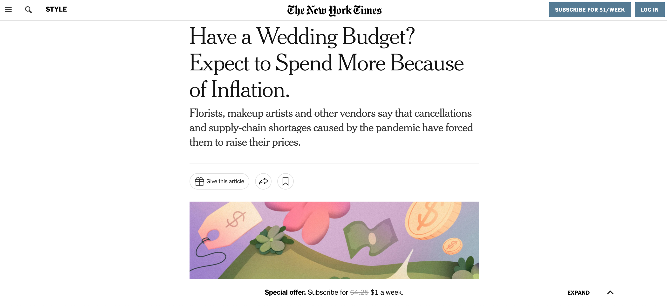 This story from the New York Times by Danielle Braff talks about the rising costs of weddings as a result from COVID. Couples mentioned in this story go on about how just the basics are more expensive than they used to be. Ms. Alvear-Beceiro and Mr. Klebba, despite not spending extra on things like food, decorations, and music, had a wedding budget that topped $30,000. Zola, a wedding planning site, said that a third of the 468 participating vendors had losses of $50,000 or more due to couples postponing weddings in 2020. Supply chain shortages later on have also helped increase the overall costs, and many businesses are still trying to operate to pre-pandemic levels. Due to rising costs, some couples are choosing to scale back the festivities. Shannon Bernadin, after looking at the costs of wedding venues with her husband, decided to have a wedding at a friend's house and use thrifted outfits, along with homemade decor. All in all, this article demonstrates the changing economy and how that has impacted the wedding industry and how people plan weddings.