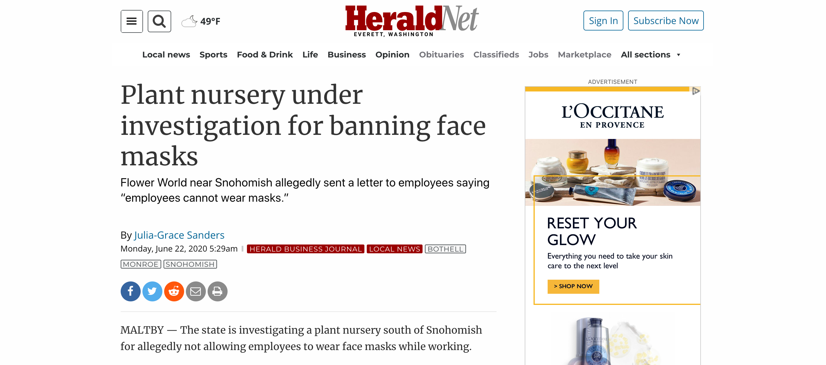 The attached article is about a plant nursery in Snohomish, Washington that banned its employees from wearing face masks on June 3, 2020. This business did not take safety precautions for its employees seriously, and actively encouraged and promoted unsafe practices. This is something that is worth being documented in the JOPTY due to the fact that the stereotype of Western Washington state is that it is very liberal, very progressive. But there are still many pockets of areas that still are not. It’s important to remember that this stereotype isn’t true. I think this is also something that is another example of the general public not taking the lives and significance that service industry/customer service workers seriously.