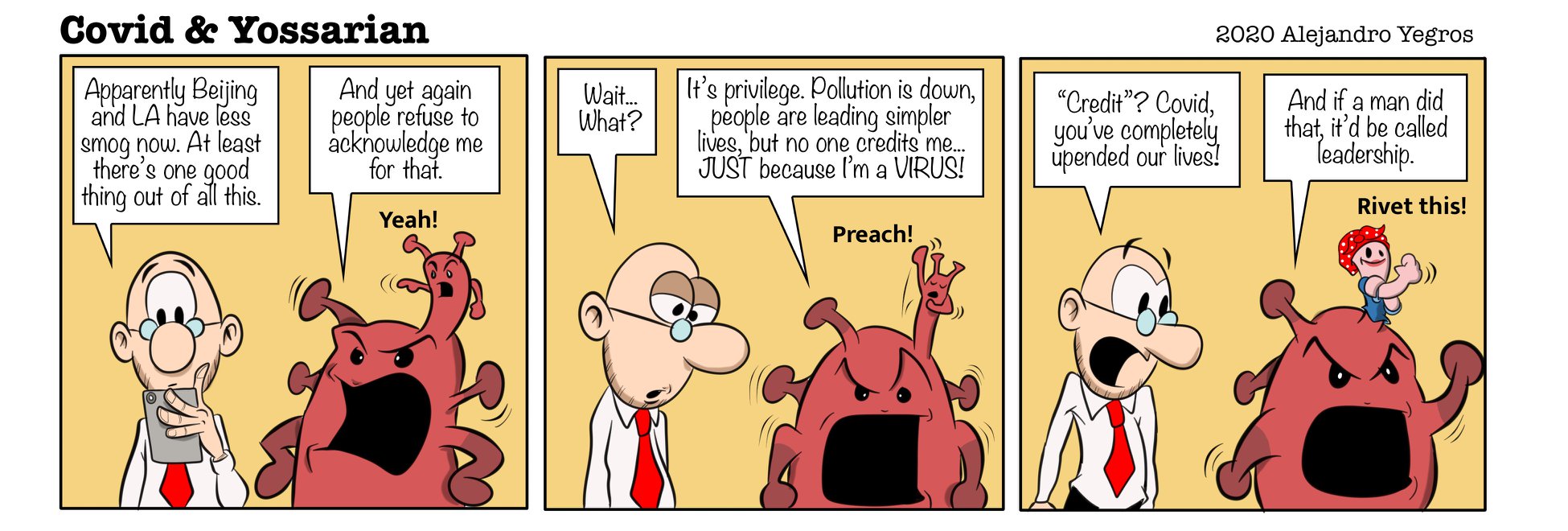 "It's privilege. Pollution is down, people are leading simpler lives, but no one credits me... JUST because I'm a VIRUS!"