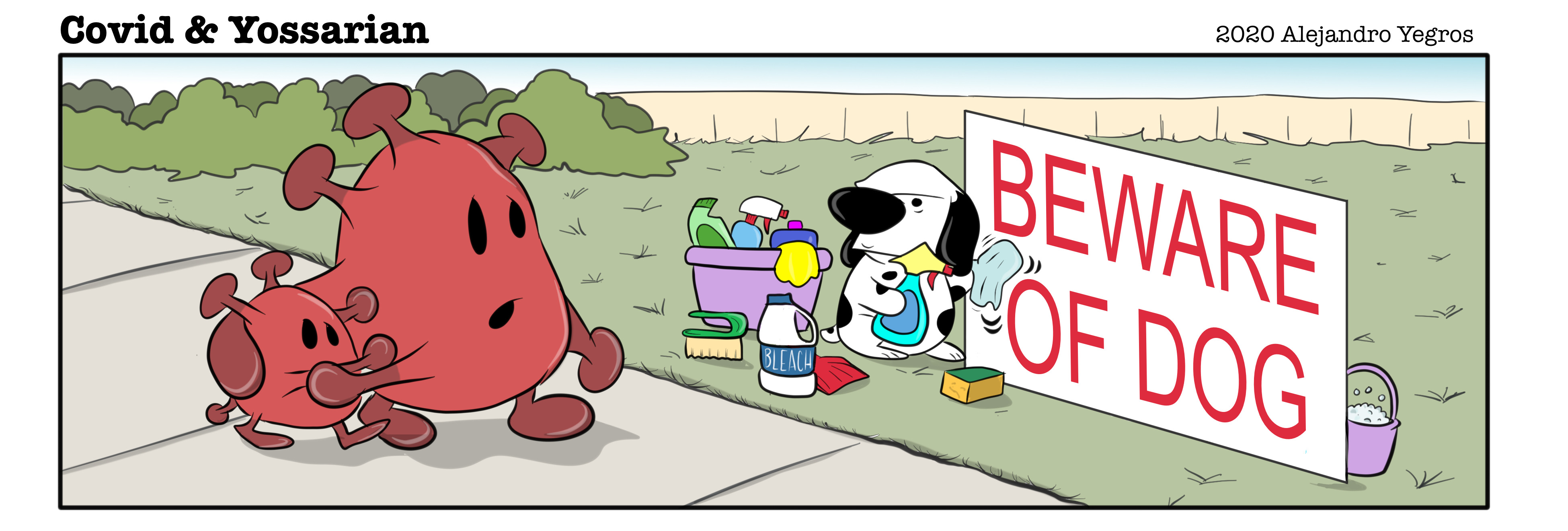 A dog cleaning and sanitizing a "BEWARE OF DOG SIGN" while watching a comic rendition of COVID passing by with a smaller COVID character.