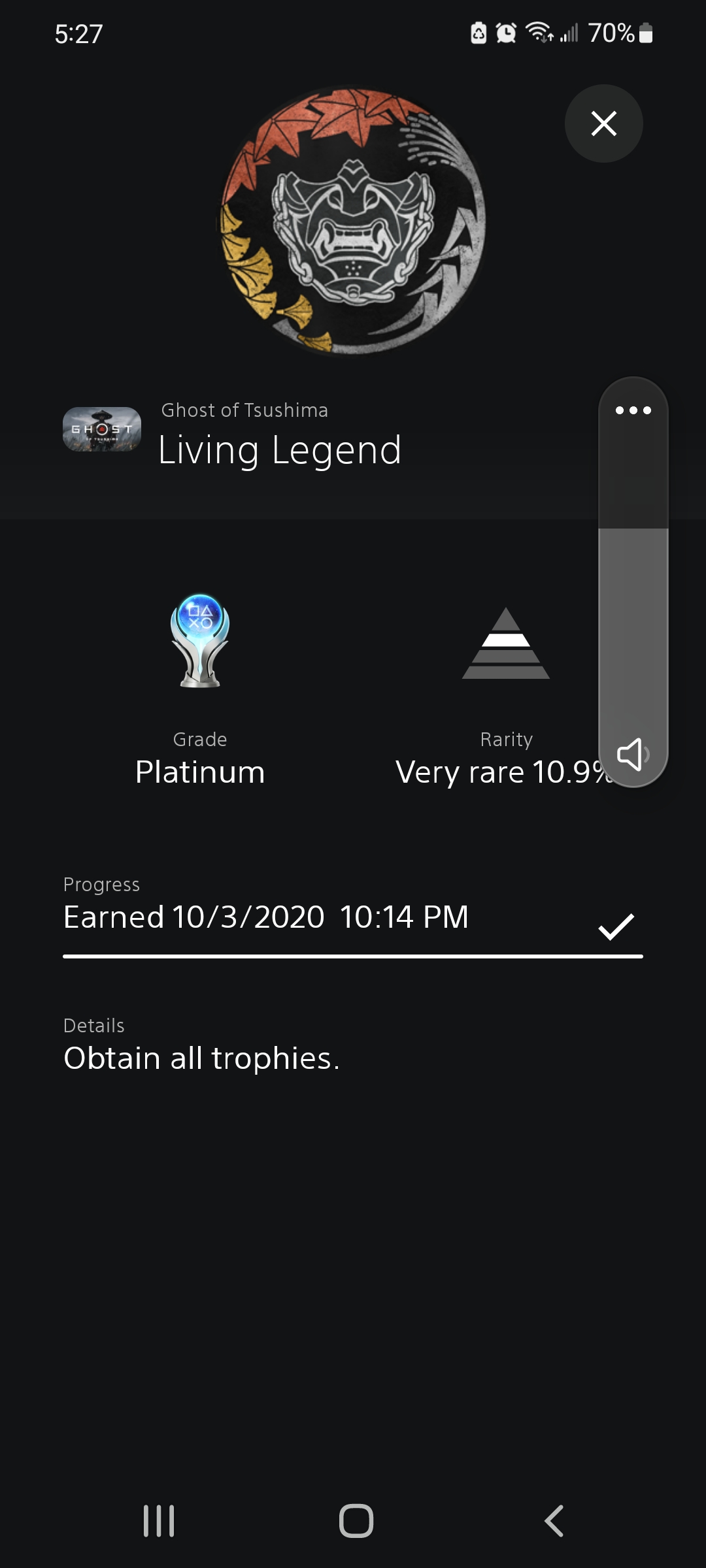 This is a picture of the platinum I received for beating the game Ghost of Tsushima on October 3rd, 2020. This game came out on July 17th, 2020 and it became my Game of the Year. This was also the year of COVID-19, so I had a lot more free time to play the game and beat it in several months. The pandemic was a difficult time and I just wanted something fun to play. I wanted to forget everything happening in the real world with the pandemic and other problems by jumping back to 13th Century Japan.