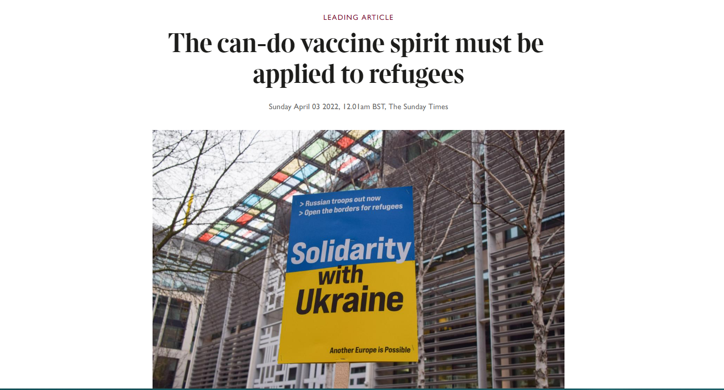 This is a news story written by The Sunday Times (cannot find author). The Sunday Times is a British paper and this is detailing the contrast between the generosity of the British citizens towards Ukrainian refugees, but the lack of care from the British federal government. It says that over 200,000 people and organizations have registered to sponsor refugees in the Homes for Ukraine scheme. The overall story is not about the vaccines themselves, but the author is wishing for the can-do attitude of distributing vaccines in the UK to be applied to the refugees. Of the visas applied by refugees, for families, 32,300 applied for a scholarship, but only 4,700 were issued. I think that during the pandemic, the author that wrote this got more used to the government being lenient in helping, but now when faced with a refugee crisis, lacks that same helpful spirit.