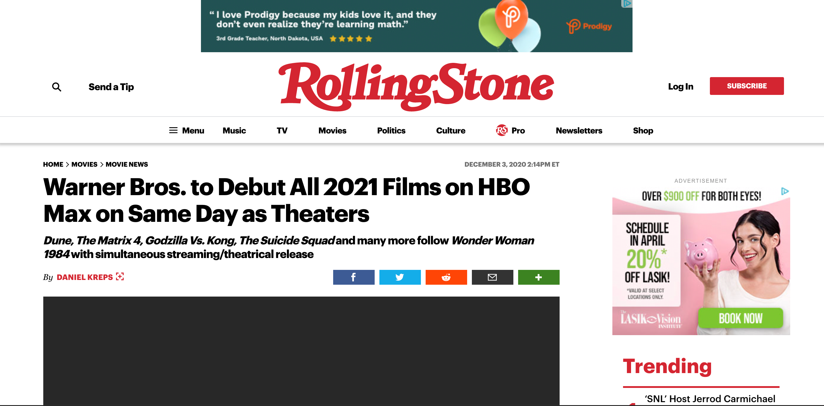 Warner Bros. announces its intentions to simultaneously release its films in theaters and on its streaming service, HBO Max. This illustrates the changes in business practices that film studios have had to consider due to the pandemic’s effect on the theater industry and audiences’ willingness to go see movies in theaters at this time. This decision would be a somewhat controversial one as filmmakers gave polarizing reactions to their films being released this way.