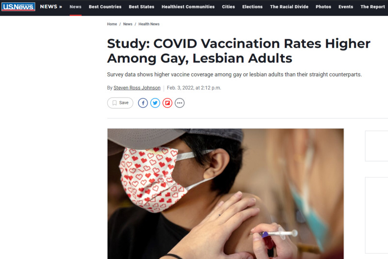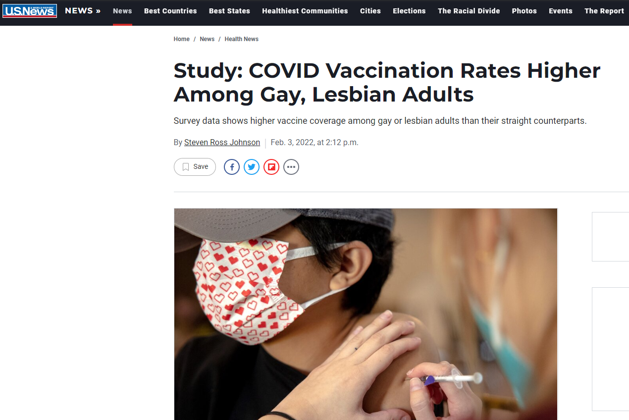 This is a news story for US News by Steven Ross Johnson. This story is about a study on how LGBTQ+ people are more likely to have been vaccinated compared to the general population. In a survey published by the CDC, 85% of gay and lesbian adults received at least one dose of the COVID vaccine compared to just 76% of heterosexual adults. Within the LGBTQ+ community, gay men had the highest vaccination rates at 89%, compared to 81% of women. Nearly 76% of trans and nonbinary adults report having had at least one dose. This study also noted income disparities among LGBTQ+ adults. Those with a $75K income or above and LGBTQ+ had a 94% vaccination rate. For those LGBTQ+ adults below poverty level, the vaccination rate was 74%. Along racial lines, White LGBTQ+ individuals had a 92% vaccination rate. Black LGBTQ+ adults reported vaccination rates of 67%. Overall, this article shows that LGBTQ+ individuals are more likely to have less vaccine hesitancy compared to the general population, though income and race make a difference when those elements are combined.