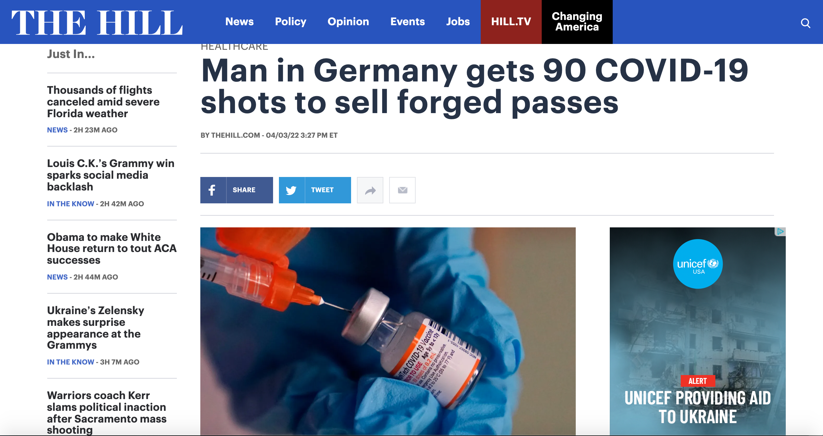 This is a story by The Hill about a German man from Magdeburg getting the COVID vaccines a copious amount of times in order to make forged vaccine cards. The man in question is 60 years old and was caught in Eilenburg in Saxony. The article states that we do not know what effects will happen after getting the vaccine 90 times. The German government has been trying to crack down on forgeries of vaccine cards. This probably speaks of a bigger nationwide issue, where people will want forgeries if forced to get the vaccines that they see as against their will. With that, brings people like this man who will get the vaccine many times in order to make money off of selling forged vaccine cards.