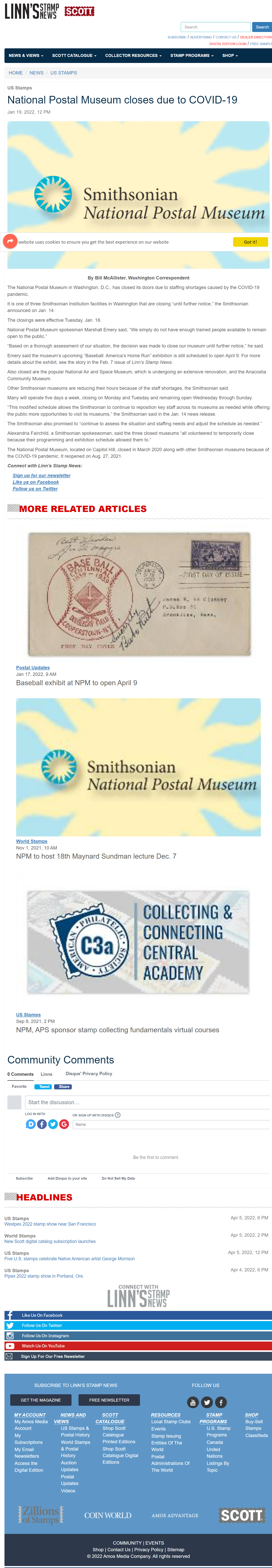 This article discusses the closure of the Smithsonian National Postal Museum in Washington D.C in January of 2022. This is significant due to the fact that its closure is a result of staffing shortages, which have been affecting museums all over the country during the COVID-19 pandemic. This is a significant contribution to the archives because museums do not have a lot of representation within the archives, especially postal museums. The article is important to me personally because I was able to visit there once while I was in Washington D.C., and it was an interesting experience.