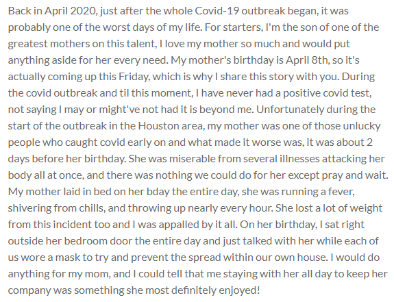 Back in April 2020, just after the whole Covid-19 outbreak began, it was probably one of the worst days of my life. For starters, I'm the son of one of the greatest mothers on this talent, I love my mother so much and would put anything aside for her every need. My mother's birthday is April 8th, so it's actually coming up this Friday, which is why I share this story with you. During the covid outbreak and til this moment, I have never had a positive covid test, not saying I may or might've not had it is beyond me. Unfortunately during the start of the outbreak in the Houston area, my mother was one of those unlucky people who caught covid early on and what made it worse was, it was about 2 days before her birthday. She was miserable from several illnesses attacking her body all at once, and there was nothing we could do for her except pray and wait. My mother laid in bed on her bday the entire day, she was running a fever, shivering from chills, and throwing up nearly every hour. She lost a lot of weight from this incident too and I was appalled by it all. On her birthday, I sat right outside her bedroom door the entire day and just talked with her while each of us wore a mask to try and prevent the spread within our own house. I would do anything for my mom, and I could tell that me staying with her all day to keep her company was something she most definitely enjoyed!