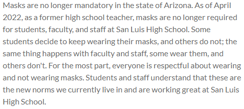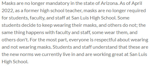 Masks are no longer mandatory in the state of Arizona. As of April 2022, as a former high school teacher, masks are no longer required for students, faculty, and staff at San Luis High School. Some students decide to keep wearing their masks, and others do not; the same thing happens with faculty and staff, some wear them, and others don't. For the most part, everyone is respectful about wearing and not wearing masks. Students and staff understand that these are the new norms we currently live in and are working great at San Luis High School.