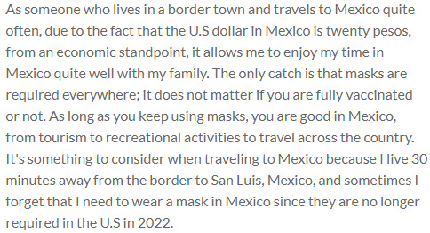 As someone who lives in a border town and travels to Mexico quite often, due to the fact that the U.S dollar in Mexico is twenty pesos, from an economic standpoint, it allows me to enjoy my time in Mexico quite well with my family. The only catch is that masks are required everywhere; it does not matter if you are fully vaccinated or not. As long as you keep using masks, you are good in Mexico, from tourism to recreational activities to travel across the country. It's something to consider when traveling to Mexico because I live 30 minutes away from the border to San Luis, Mexico, and sometimes I forget that I need to wear a mask in Mexico since they are no longer required in the U.S in 2022.