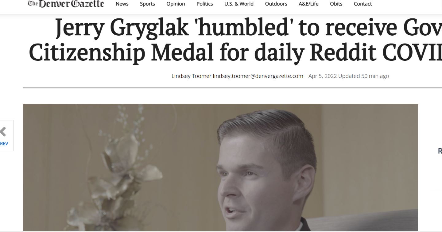 This is a news story from The Denver Gazette by Lindsey Toomer. Since June 2020, Jerry Gryglak has posted COVID updates on the subreddit r/CoronavirusColorado, and breaking down the information to be more user-friendly. This has helped Redditors get better information on the virus. Due to his diligence, Governor Jared Polis is recognizing Gryglak as one of Colorado's COVID Heroes and will get the Governor's Citizenship Medal. Gryglak left posts on Reddit with updates on deaths, hospitalizations, vaccines, and other such information. Gryglak is unsure how much longer he will be posting these updates.