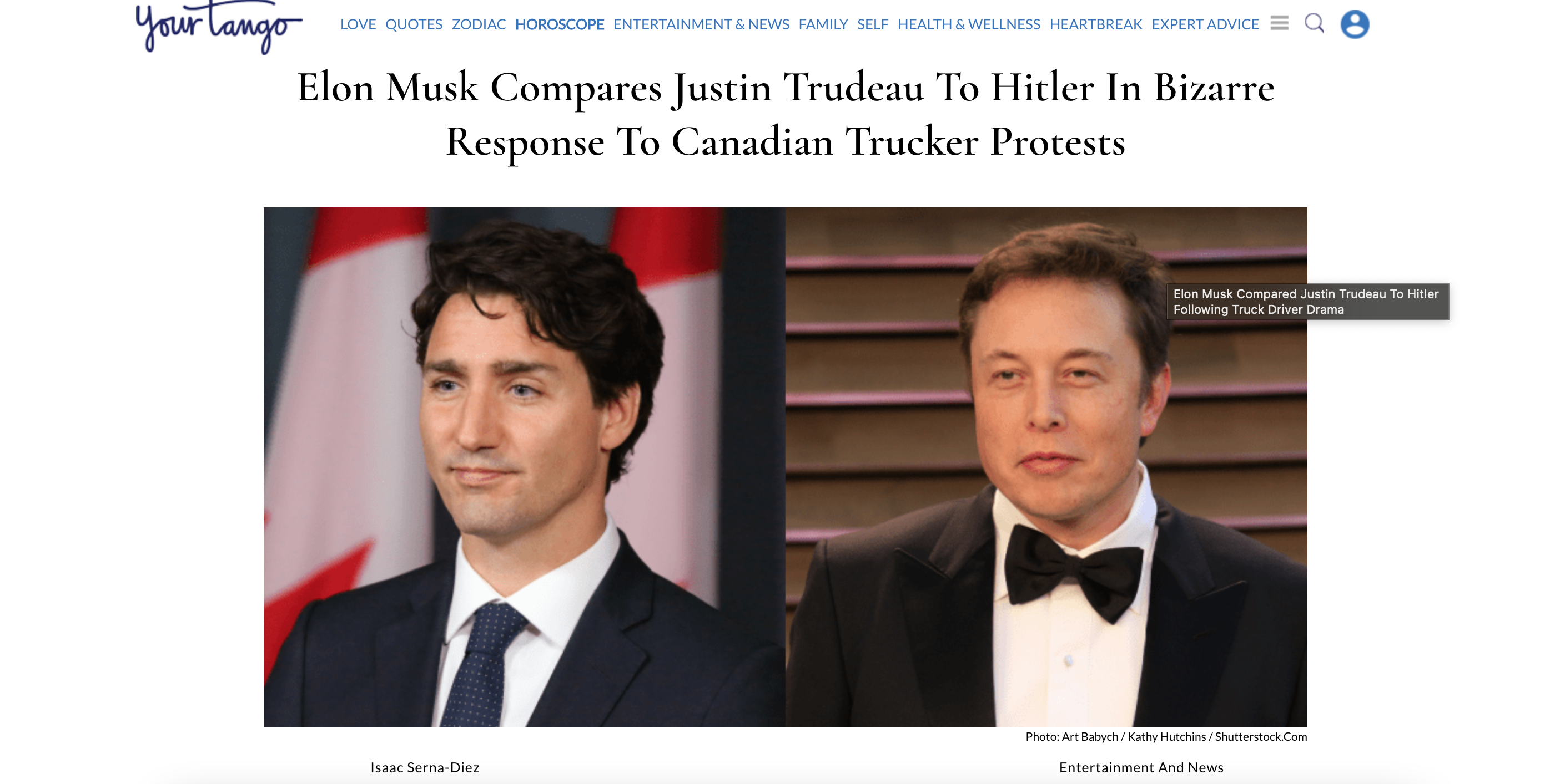 This is a news story from Your Tango by Isaac Serna-Diez. This is about a Twitter rant, where Elon Musk, owner of Tesla, compares Prime Minister Justin Trudeau to Adolf Hitler over the Canadian Trucker Protests. In January, both the United States and Canada imposed vaccine mandates. According to the American Trucking Association, only 50-60% of all truckers are vaccinated. The truckers have created a convoy that blocks traffic across the US-Canada border in response to the mandates. Trudeau's response to this was to invoke the Emergencies Act, which has't been used since 1988. The Emergencies Act allows for freezing of bank accounts and funds in order to take money away from those protesting. These freezes would also impact things like GoFundMe and the ability to raise funds from that site. It also allows for military involvement, but Trudeau says that he has no plans of doing so. Musk's response to what Trudeau imposed economically on protesters prompted him to promote cryptocurrency more.