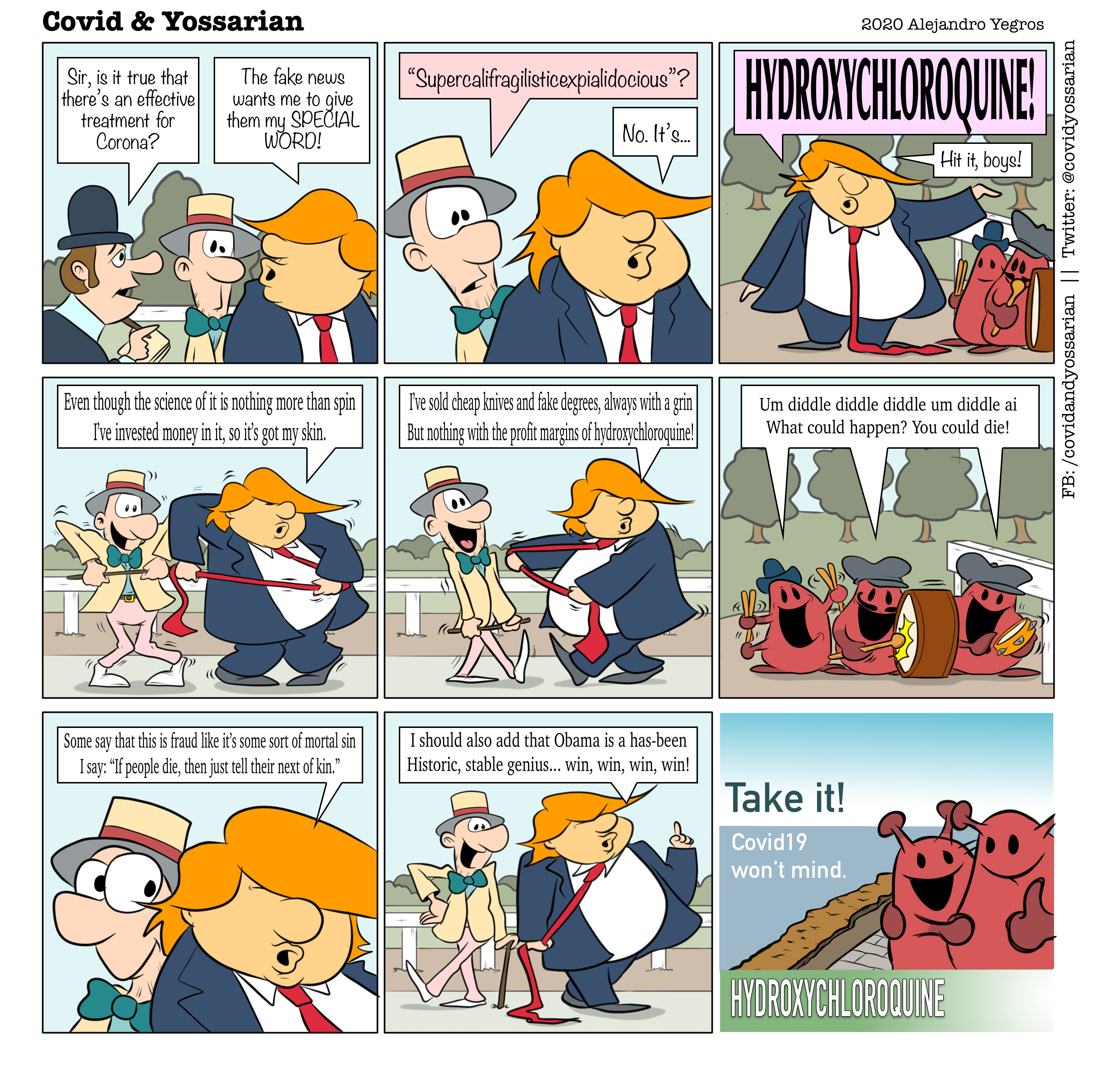 "I've sold cheap knives and fake degrees, always with a grin But nothing with the profit margins of hydroxychloroquine!"