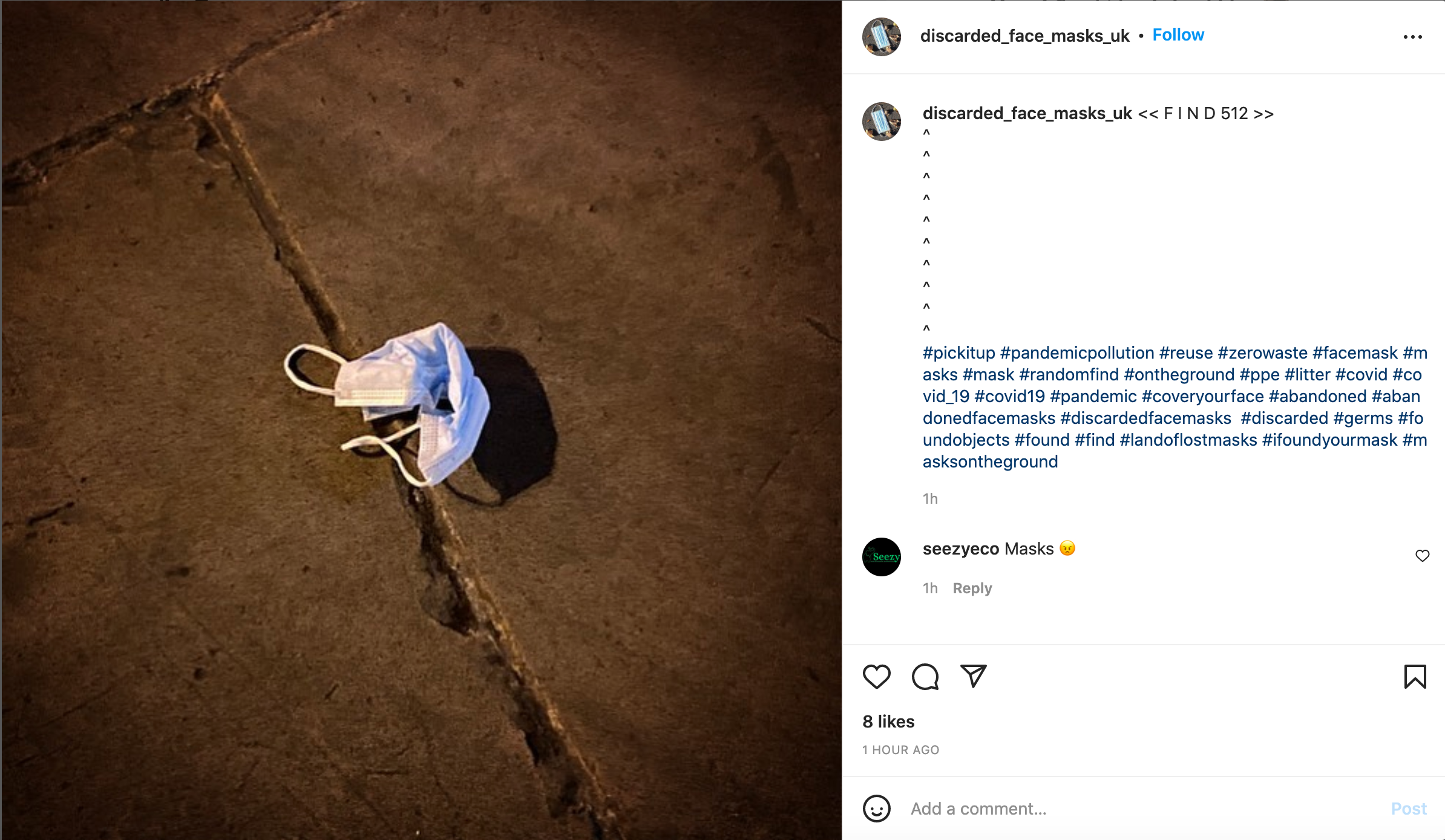 This is an Instagram post by discarded_face_masks_uk. This is an account that shows people that have left their face masks on the ground, thus making it worse for the environment. Hashtags like #coveryourface do imply that they still want you to wear a mask, but are against people accidentally leaving them on the ground. This helps speak of a larger issue where with mask mandates in places in some areas, it leaves more opportunity for people to litter with their face masks, as people will take them off at times when doing certain tasks or if they think they don't need one in some specific area.