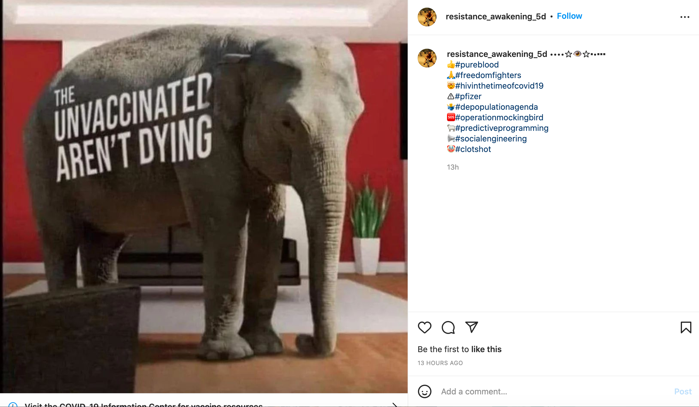 This is an Instagram post by resistance_awakening_5d. This user posted a picture in reference to the "elephant in the room" regarding vaccines. This being that the unvaccinated are not dying. The user added tags like #pureblood, which means someone that has not gotten the vaccine, and is therefore "pure." Other tags include #depopulationagenda, which references the idea that the vaccines are meant to depopulate the world. #clotshot refers to the user believing the vaccines cause blood clots. These are just a few meanings of the tags used by the author of this post.