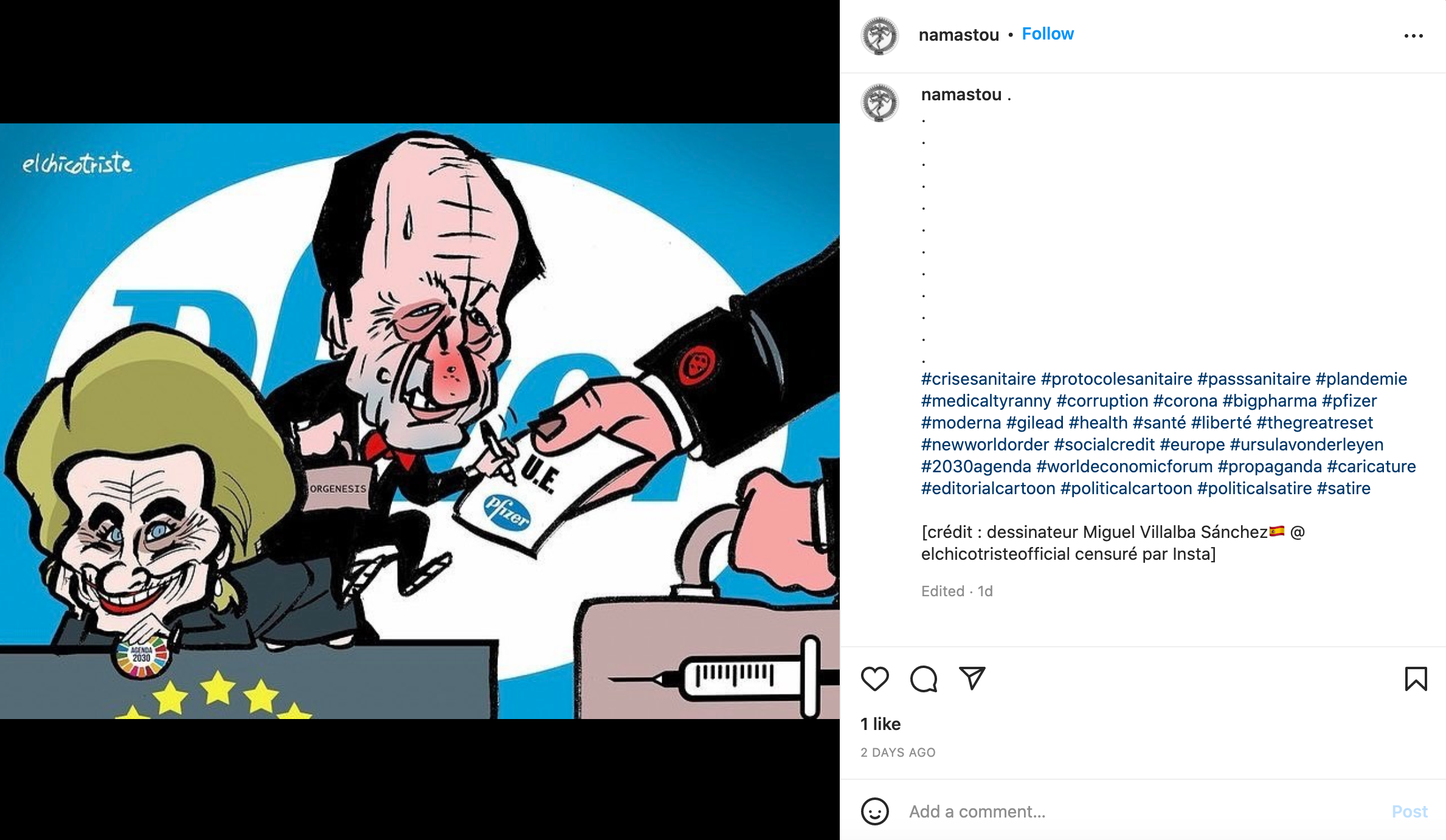 This is an Instagram post by namastou. This post is partly in French. The picture depicted are people part of the European Union signing a deal with Pfizer, one of the vaccine producers. The 2030 Agenda that is referenced is about the year 2030 being the year all the problems COVID has caused will be solved. An article is linked to this post in order to give more context to the 2030 Agenda and what it means for this comic. The conspiracy theories surrounding the 2030 Agenda also have to do with the New World Order, which has been a long-standing conspiracy theory even before the pandemic happened.