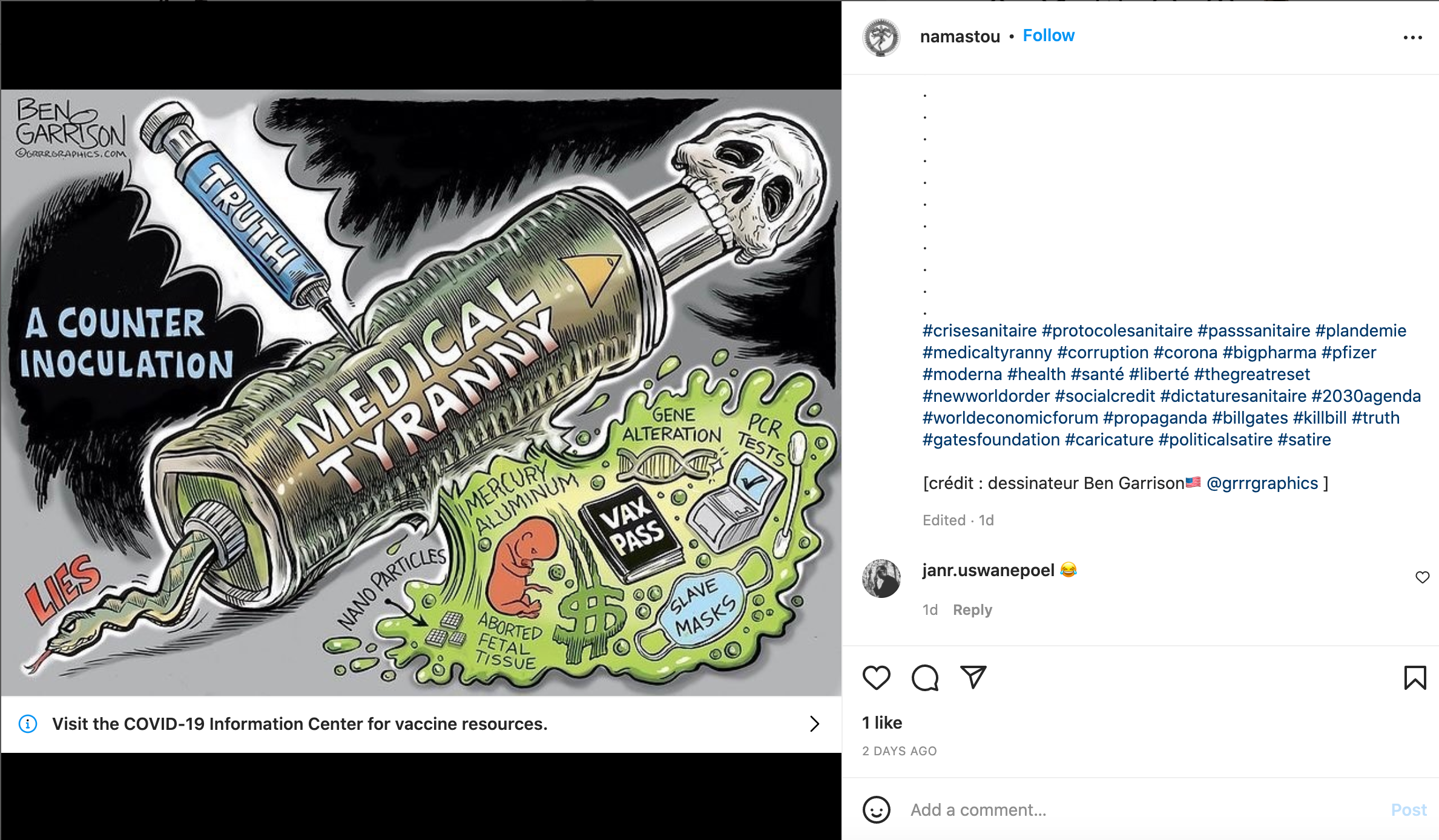 This is an Instagram post by namastou, and is partly in French. The comic posted in addition to the caption is by Ben Garrison, a political comic artist based in the United States. The comic shows how "truth" is being injected into "medical tyranny", and with that, the truth is that the masks are akin to making you slaves to the government, the vaccines cause gene alteration, and that PCR tests can come out as a false positive.
