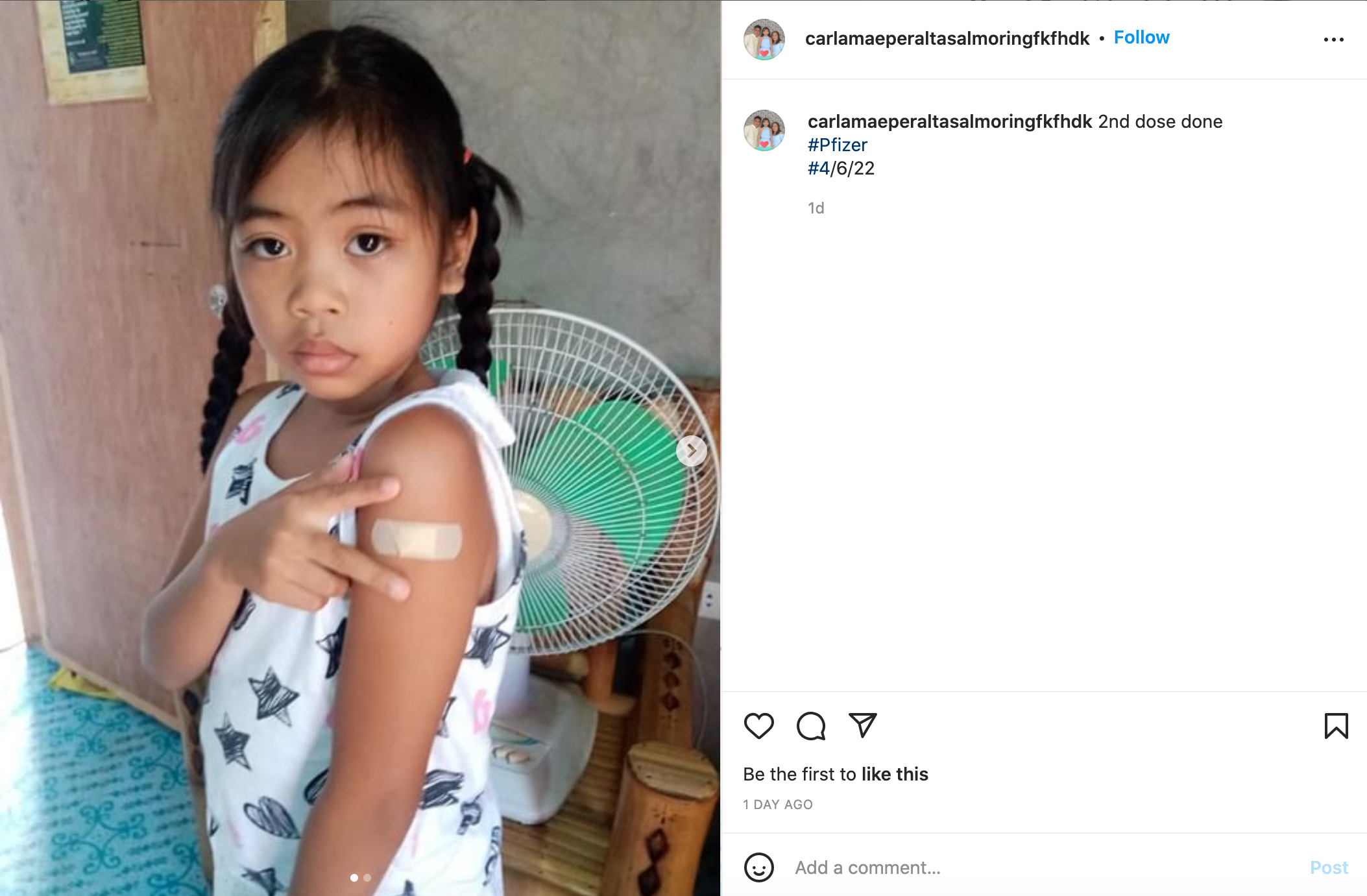 This is an Instagram post by carlamaeperaltasalmoringfkfhdk. This picture shows a kid that just got their second dose of the Pfizer vaccine. The date says that the shot happened on April 6, 2022.