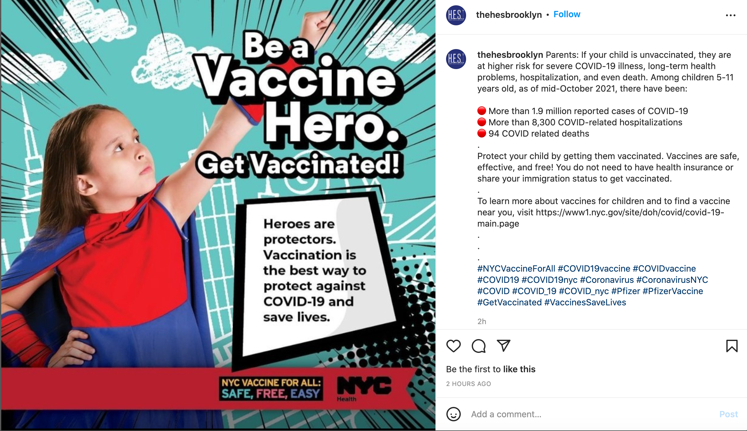 This is an Instagram post by thehesbrooklyn. This is a post encouraging children to get vaccinated. This post has a link to the New York City government website on more information on COVID. The picture shows a little girl dressed as a super hero as part of the PSA.