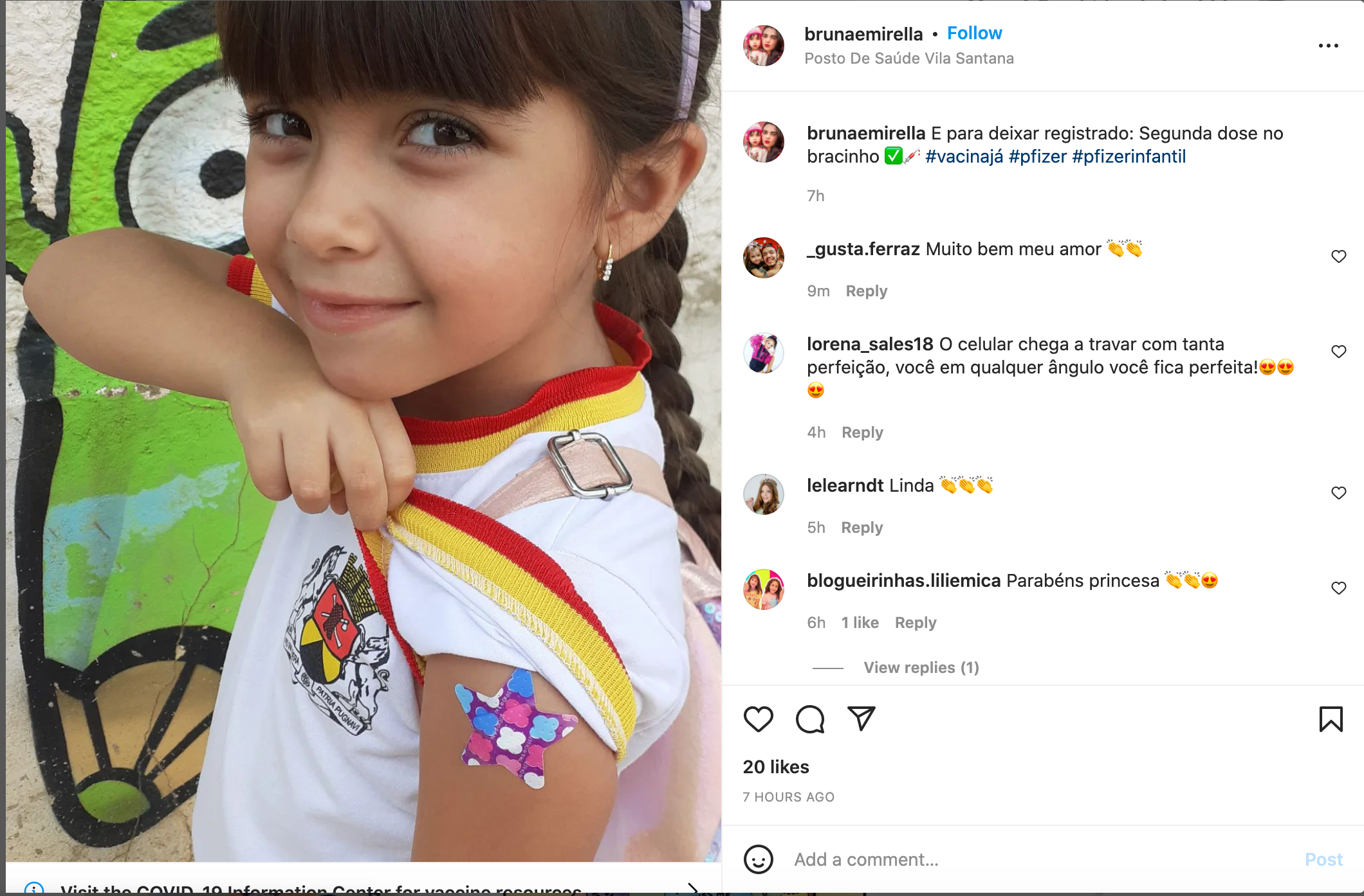 This is an Instagram post by brunaemirella. This post is in Portuguese. This is a picture of a little girl that just received her second Pfizer dose.