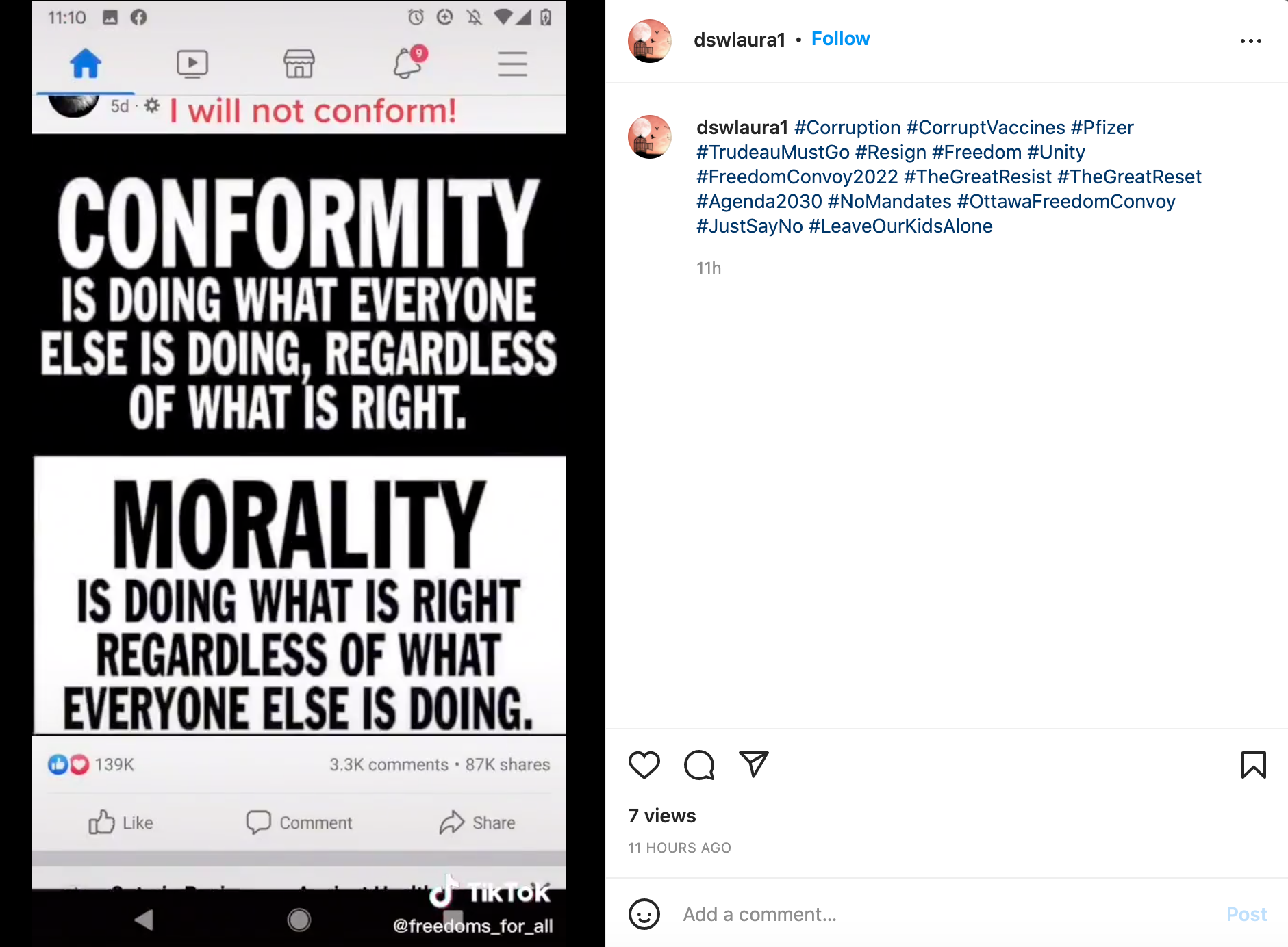 This is an Instagram post by dswlaura1. This post shows a TikTok video, with hashtags as a description. The tags refer to things like the Ottawa Freedom Convoy, which has been a massive ongoing protest against vaccine mandates in Canada. Other tags include references to "The Great Reset", which is a conspiracy theory that the pandemic was created in order to make people more subservient to elites in power, while losing both their money and freedoms in the process. "Agenda 2030" is another conspiracy theory where it was established that 2030 will be the official "end" to the virus, along with other things.