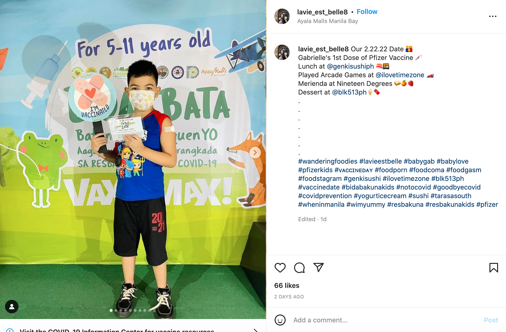 This is an Instagram post by lavie_est_belle8. This is a post about Gabrielle getting his first COVID vaccine dose. Based on the caption, it looks like the parent/guardian planned a fun day with Gabrielle after getting the shot, including: out for sushi for lunch; games at the arcade; and out for dessert at the end. Gabrielle is standing in front of a backdrop and holding a "I'm Vaccinated" sign.