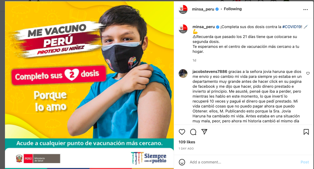 This is an Instagram post by the Ministry of Health in Peru informing people to wait 21 days and then go get the second COVID-19 vaccine dose in the vaccination center closest to their home.