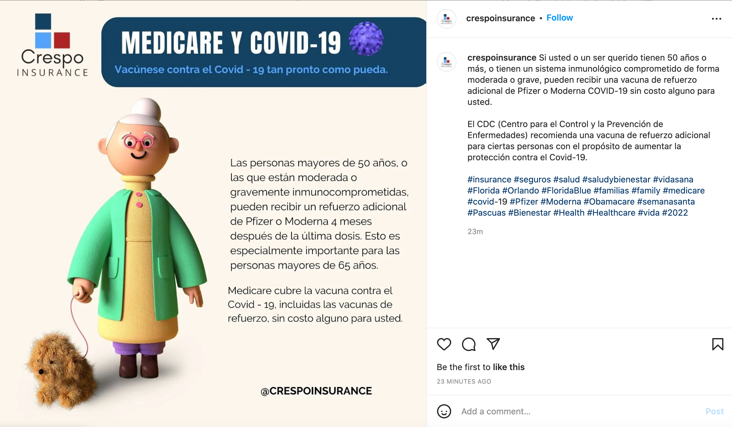 This is an Instagram post by crespoinsurance. This is a post written in Spanish giving advice to elderly on vaccines. It advises people fifty and older, and those that are immunocompromised to get vaccinated. It also says that Medicare covers COVID vaccines.